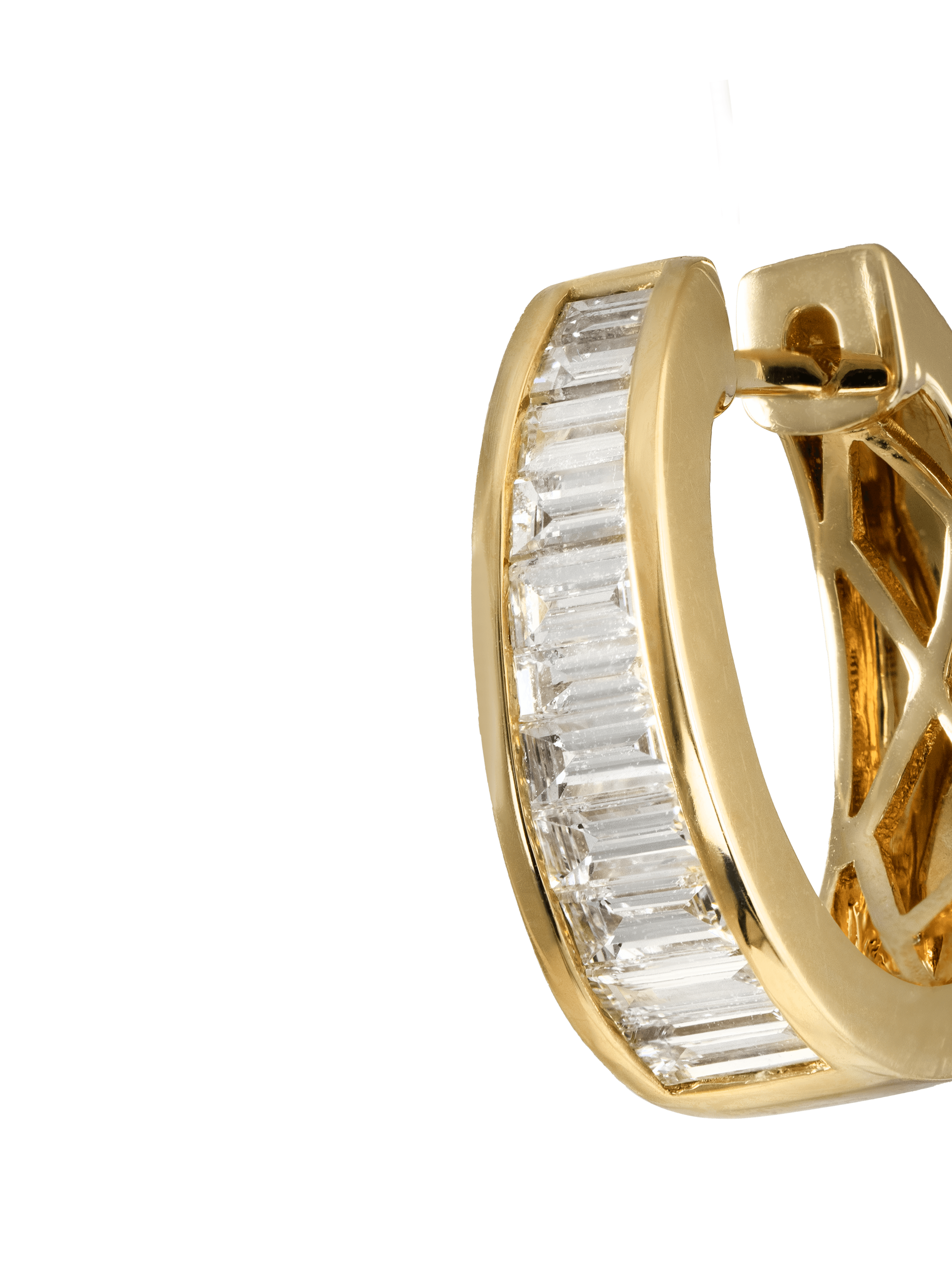 〝Anita Ko’s Meryl gold huggies are an elevated take on classic hoops, set with the LA-based designer's trademark baguette diamonds for timeless style.〞