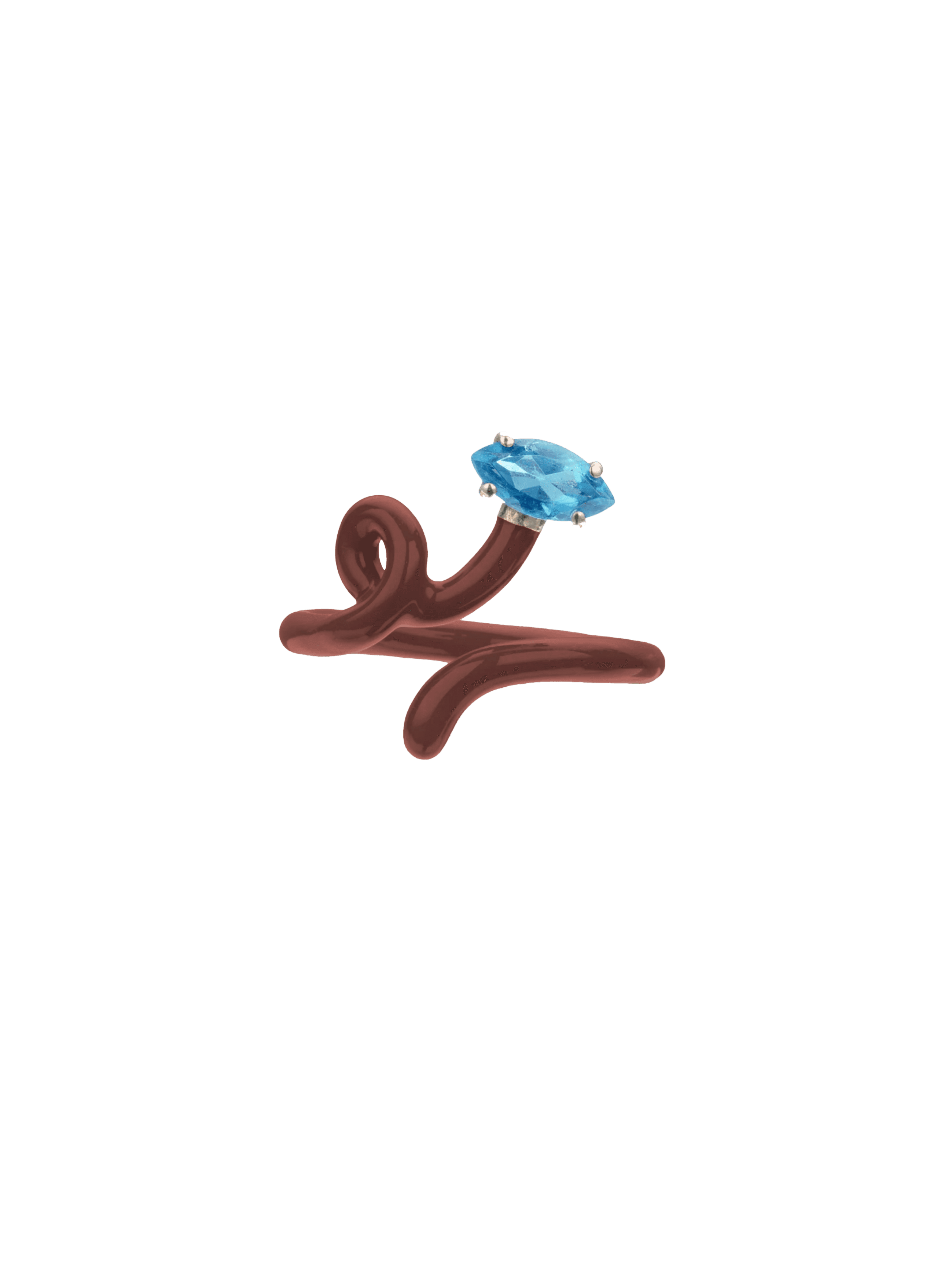 〝Bea Bongiasca’s distinctive look mixes brightly colored enamel with radiant gemstones, an uplifting combination that’s a super stylish shot in the arm, in jewelry form. Here, the Baby Vine Tendril Ring works brick enamel and blue topaz.〞