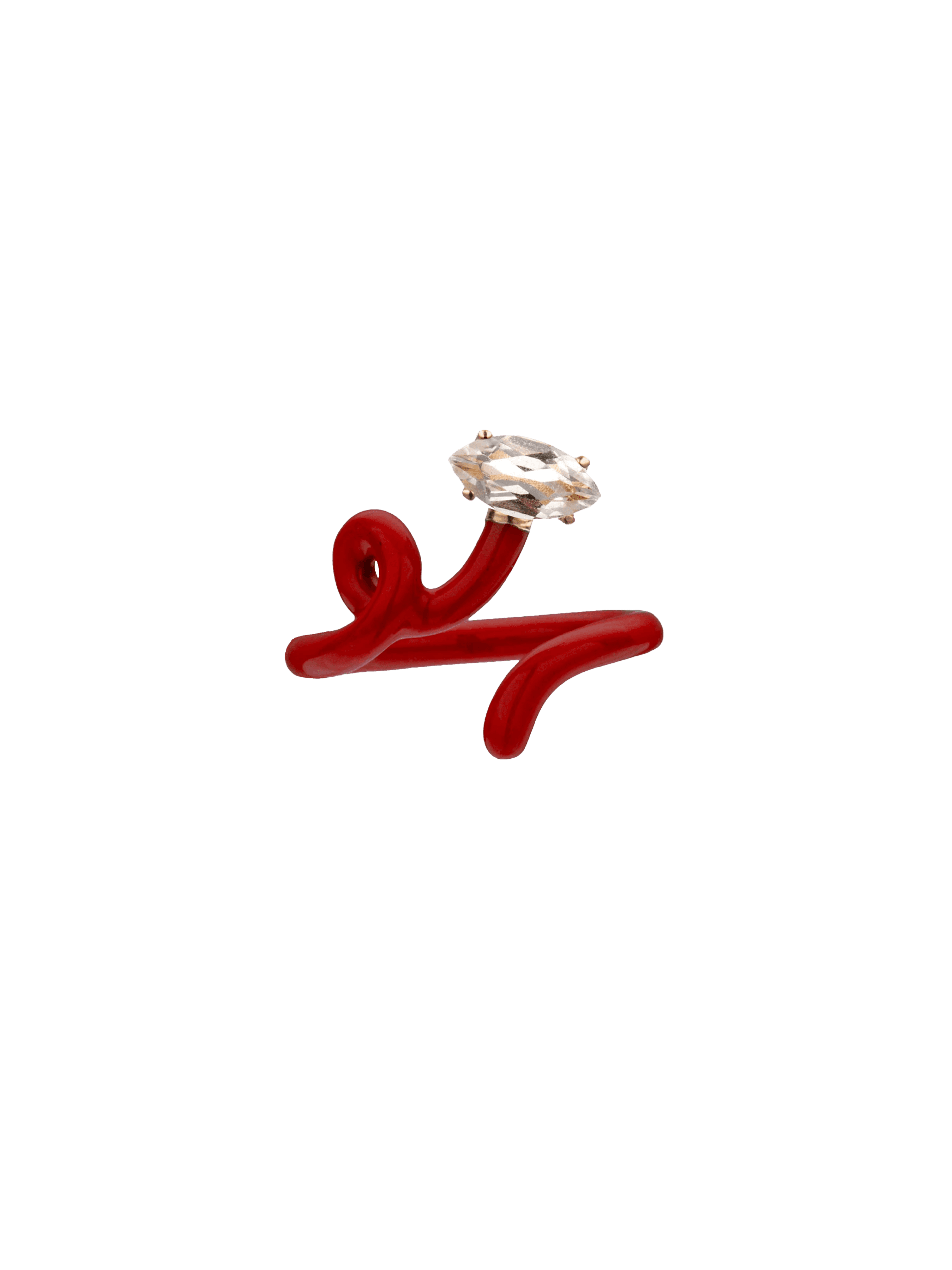 〝Bea Bongiasca’s distinctive look mixes brightly colored enamel with radiant gemstones, an uplifting combination that’s a super stylish shot in the arm, in jewelry form. Here, the Baby Vine Tendril Ring works vibrant burgundy red and rock crystal.〞