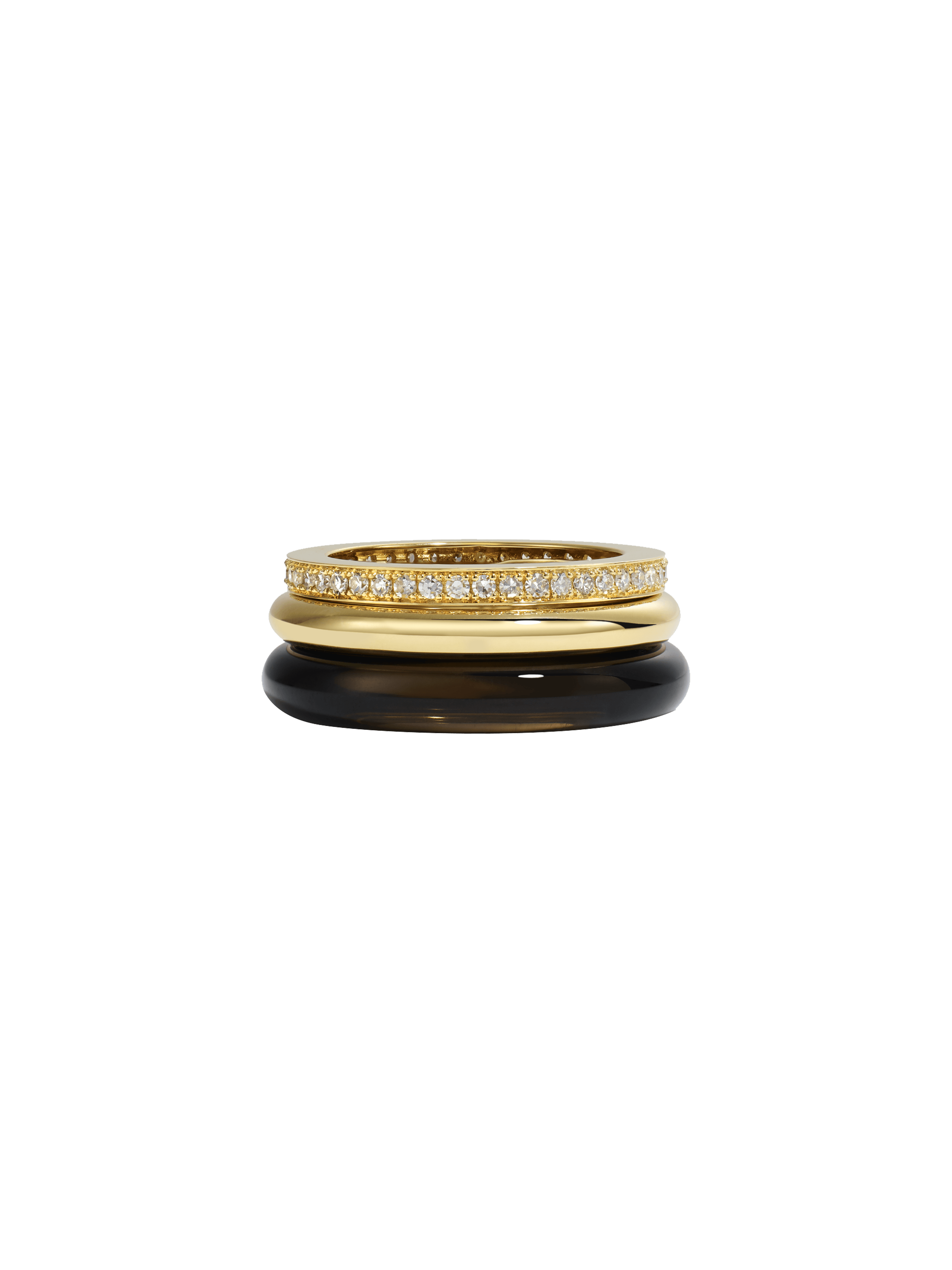 〝In a more delicate version of By Pariah’s signature ready-made ring stack, smooth smokey quartz takes center stage in an easy-elegance ring stack. 〞