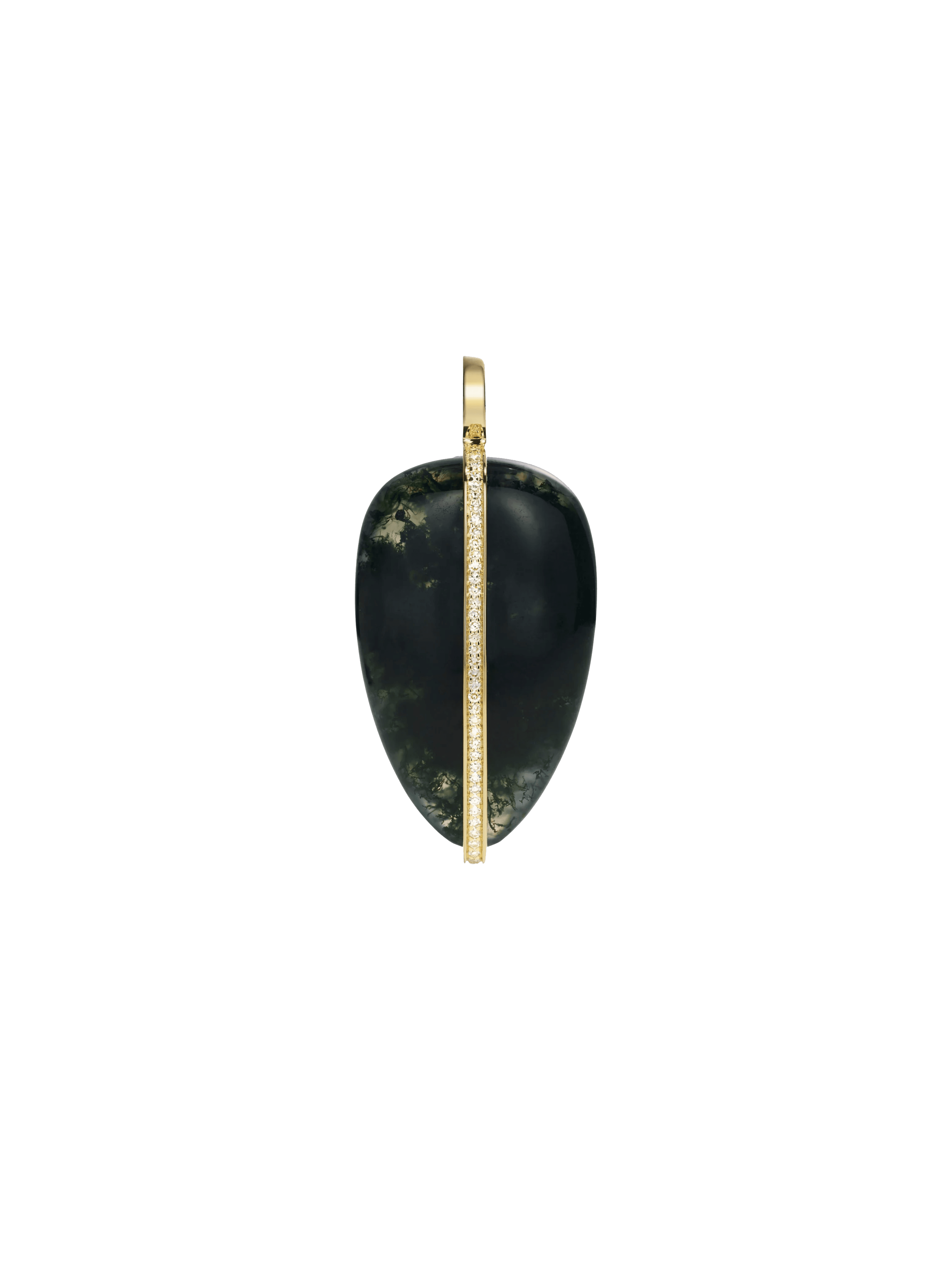 〝Lose yourself in the depths of moss agate, bisected with a streak of gold and diamonds, in the XL Pebble pendant from By Pariah, for an easy statement piece. 〞