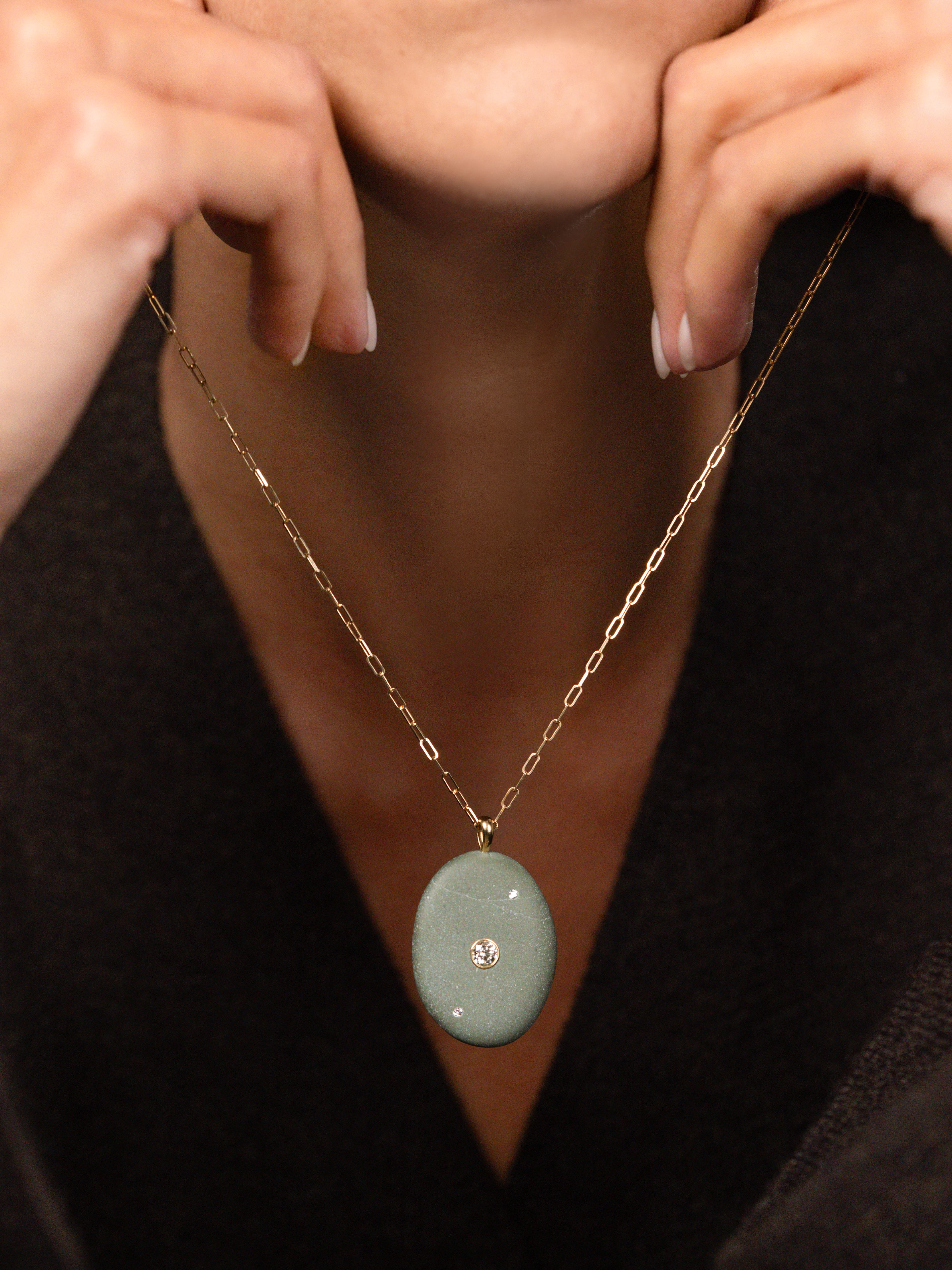 〝CVC Stones honors the rainbow of natural mineral colors, with a forest green pebble elevated with three white diamonds into a one-of-a-kind statement piece.〞