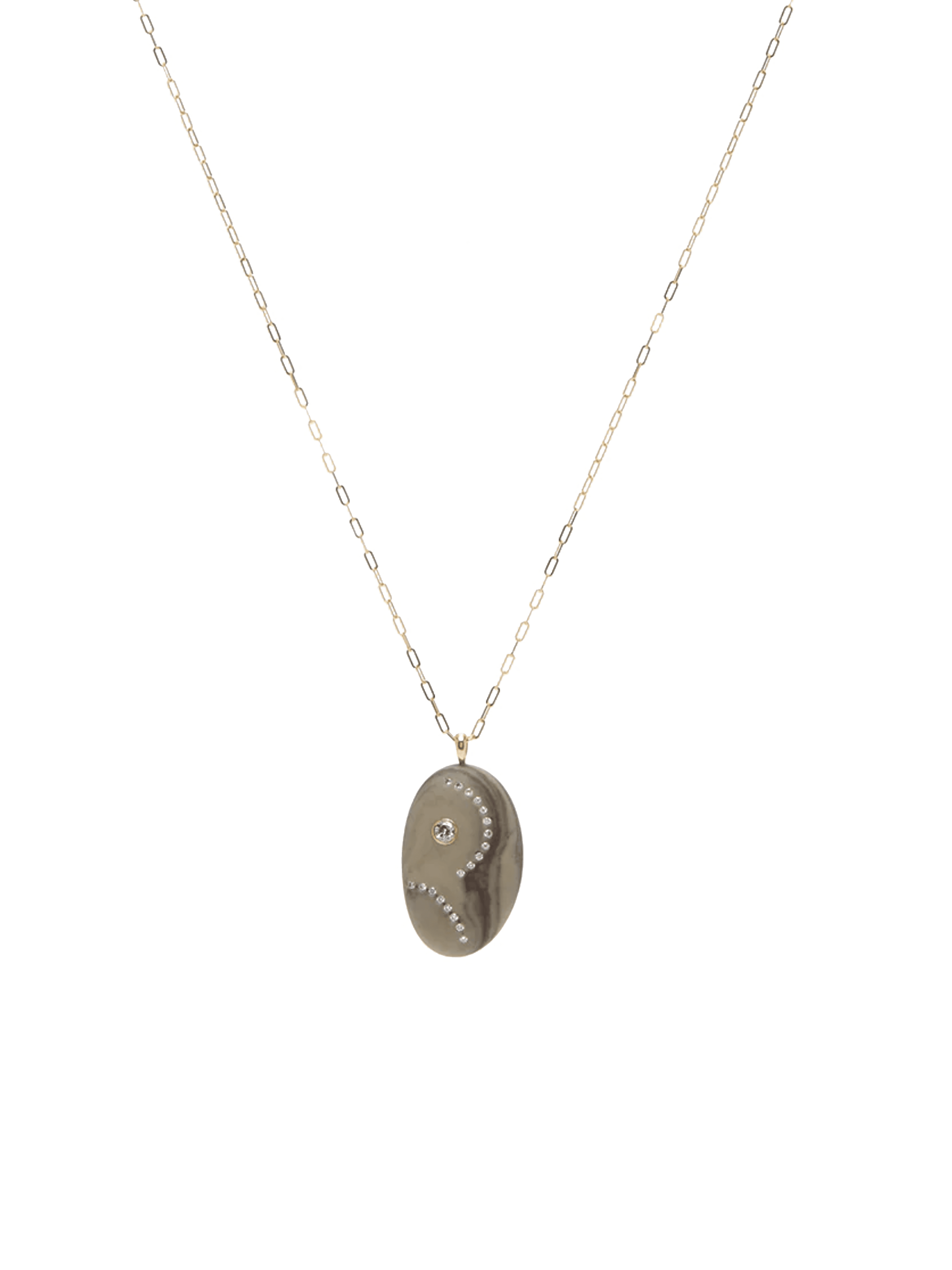 〝A naturally textured pebble is accented with delicate white diamonds in the Granite necklace by CVC Stones. Hand-selected from beaches around the world, each piece is entirely one of a kind, blending raw texture with refined detail.〞