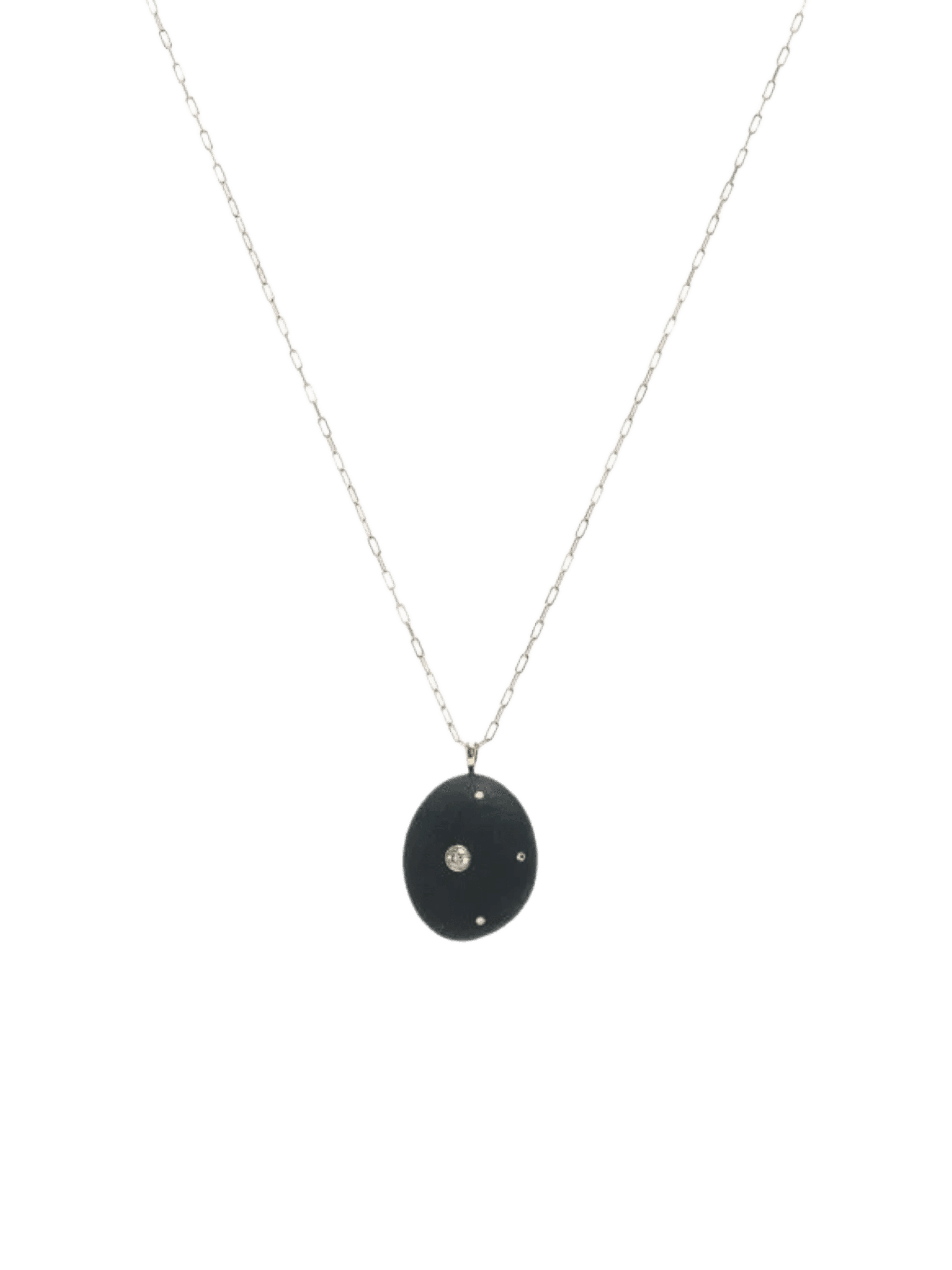 〝A naturally shaped pebble is accented with white diamonds in the Elvira necklace by CVC Stones. Hand-selected from beaches around the world, each piece is one of a kind, uniting organic form with refined detail.〞