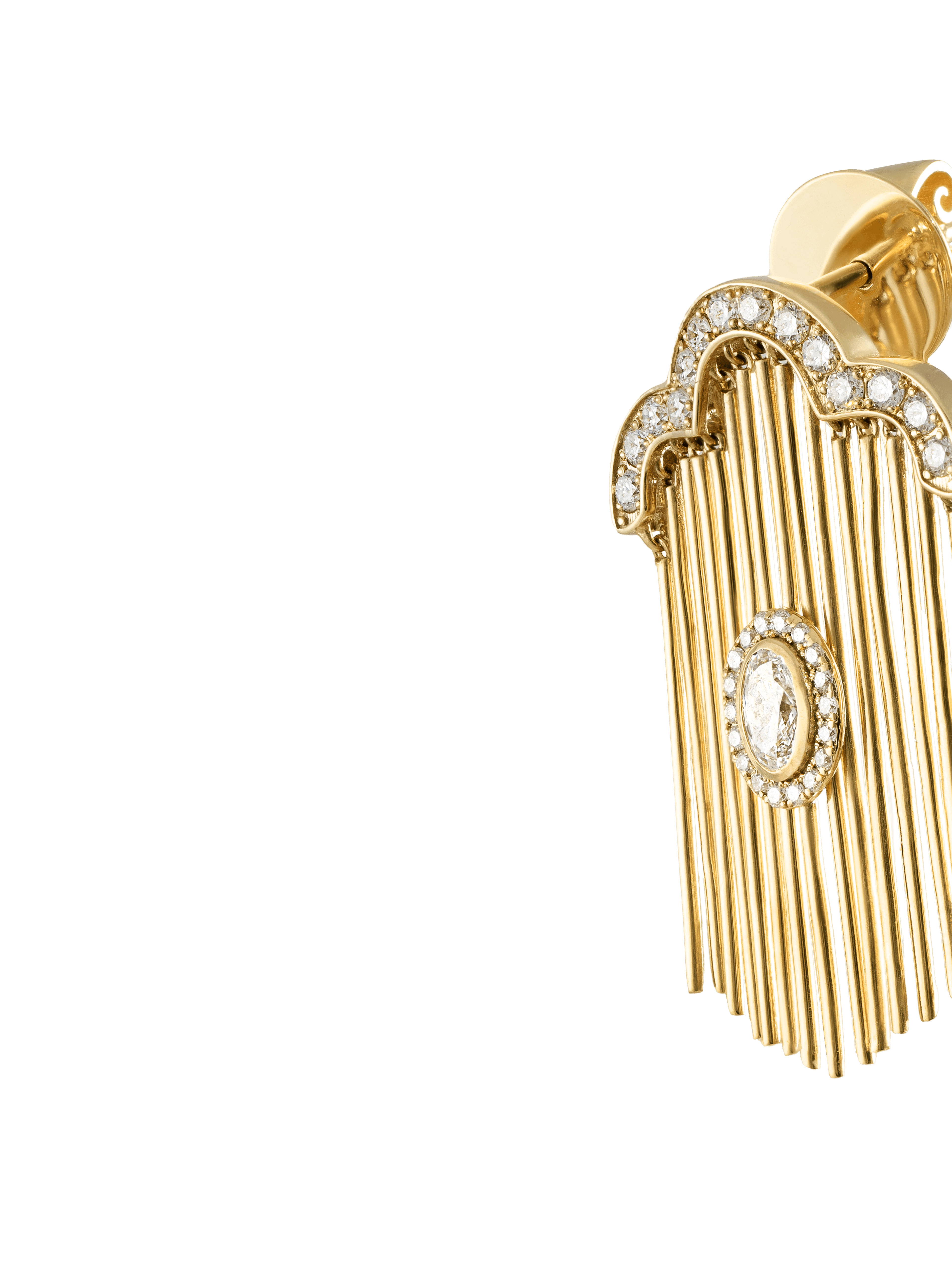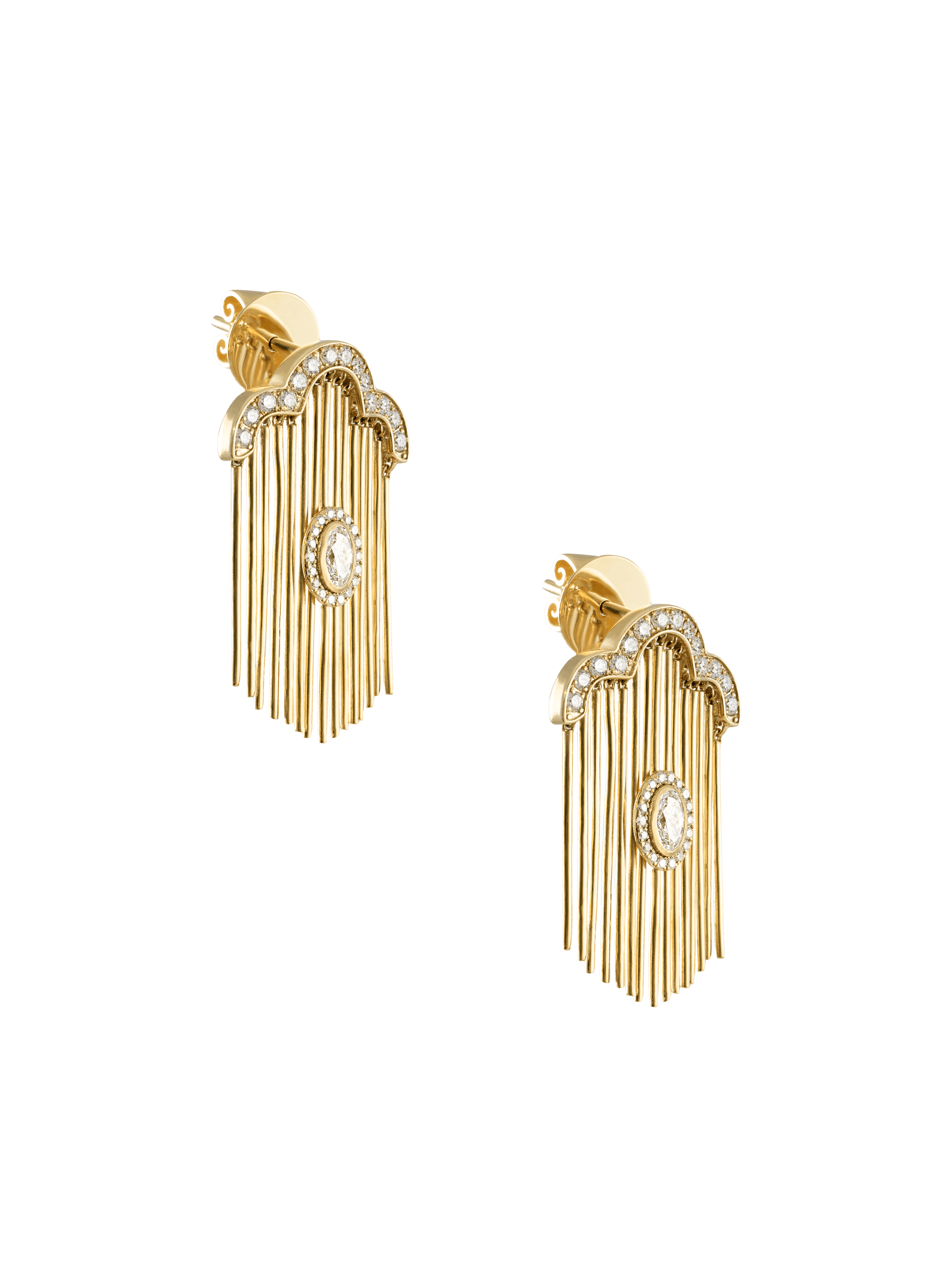 〝With gold bar fringing and showstopping diamond detailing, Joanna Dahdah’s Merveilles Oh Crown earrings are a spectacularly chic addition to your evening wear.〞