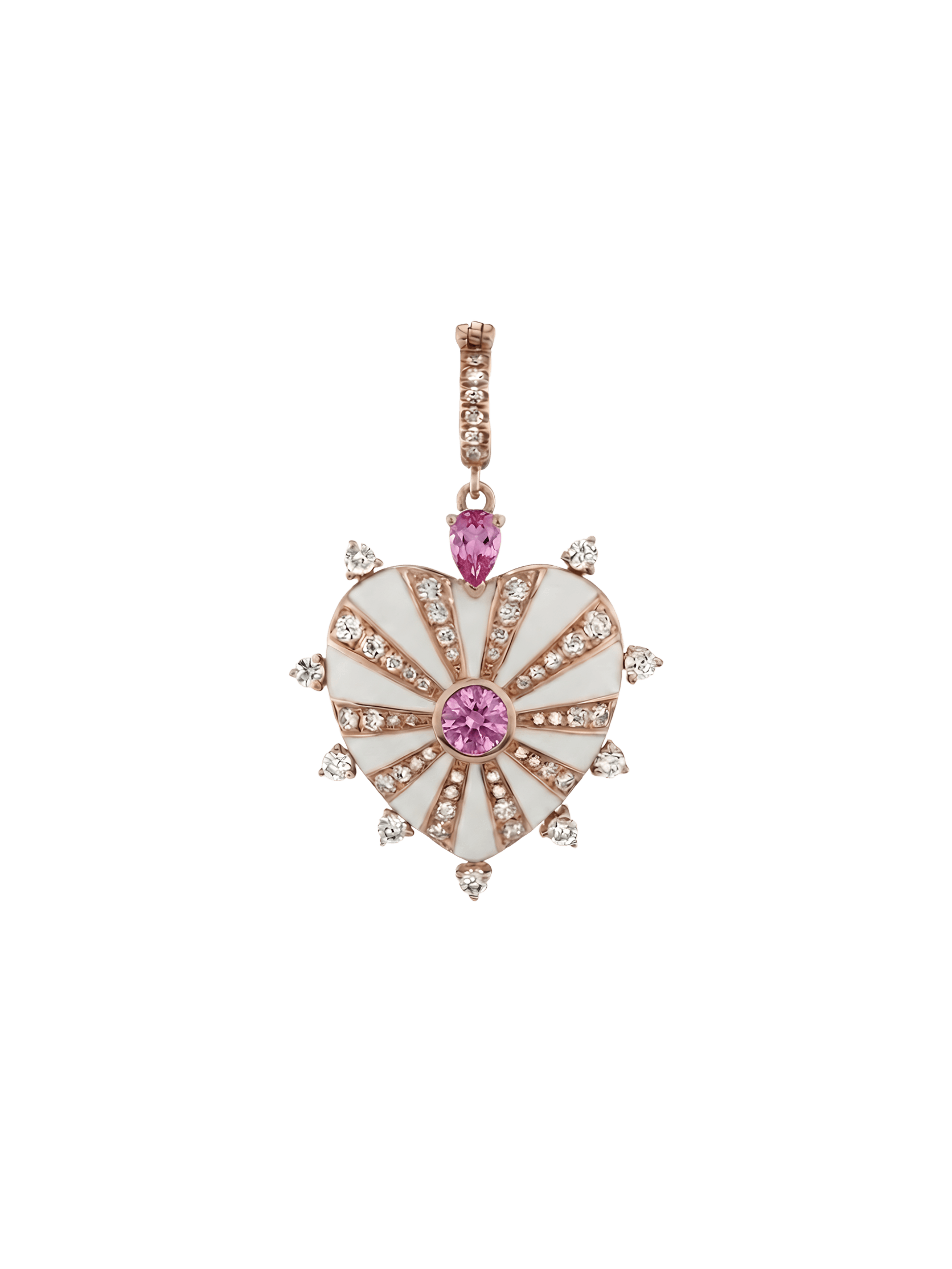 〝The Mila heart is Joanna Dahdah’s signature charm, an ornate and richly decorated symbol of love in white enamel, diamonds and pink sapphire. Pair with her diamond hook chain to build your own charm necklace, or layer up Mila hearts of different sizes to represent family and loved ones. [...]〞