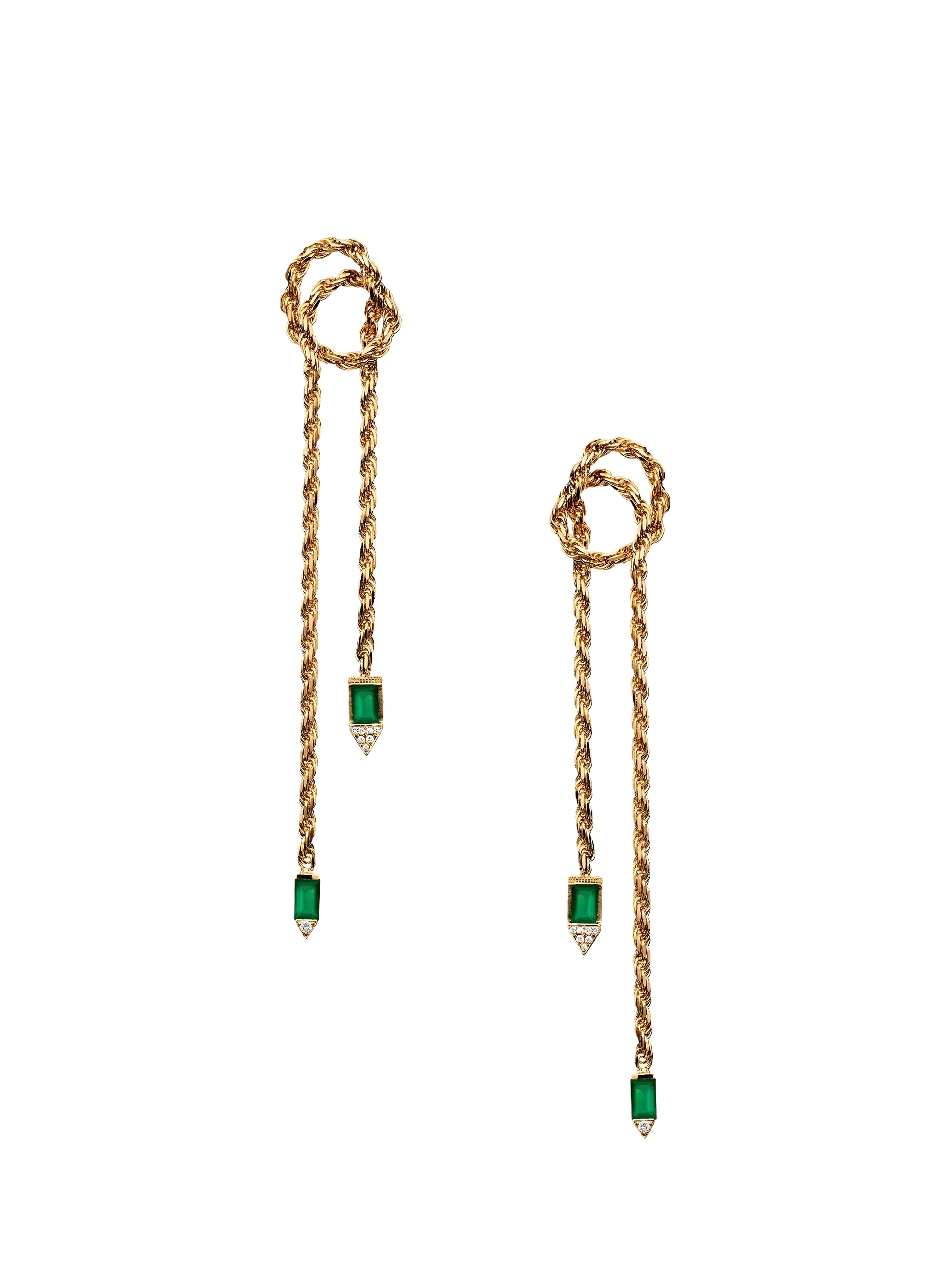 〝Tiny green agate and diamond points fall towards the shoulders on ropes of gold from an open knot, in the Knot Me Over diamond earrings by Lito.〞