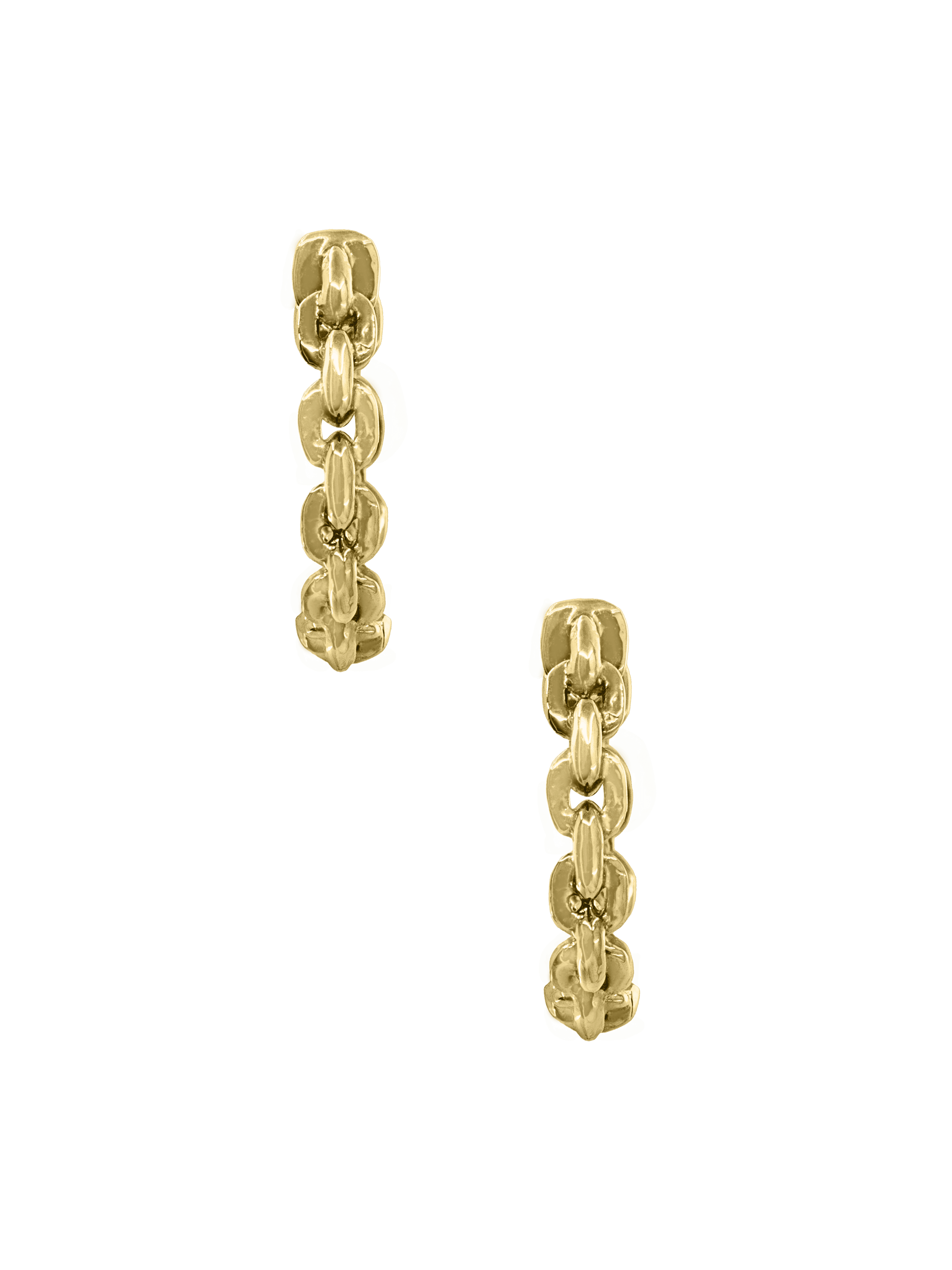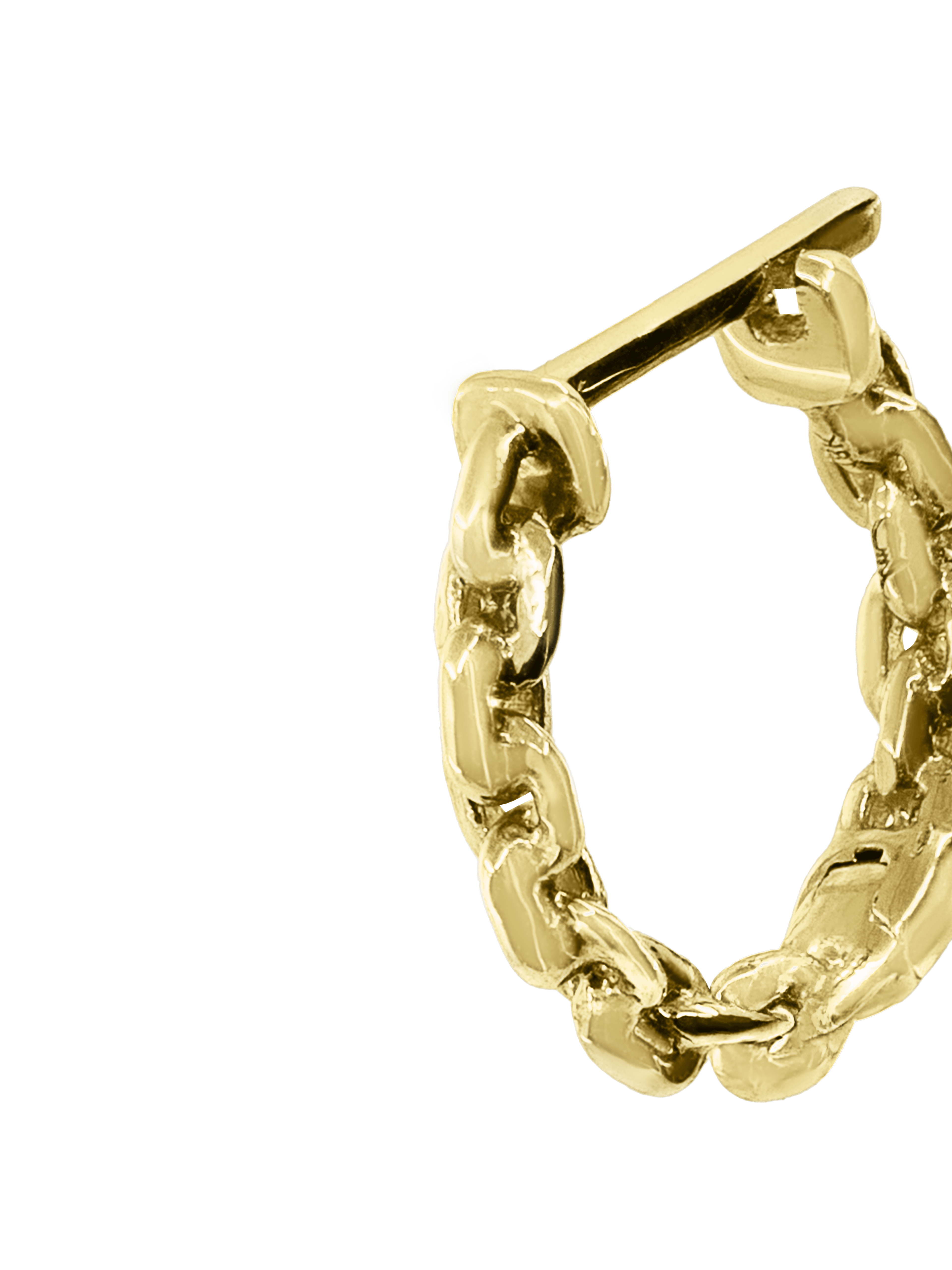 〝The Knife Edge Chain huggie takes Lizzie Mandler's signature motif to the ears, providing a fresh take on a jewelry box staple, with added character and style.〞