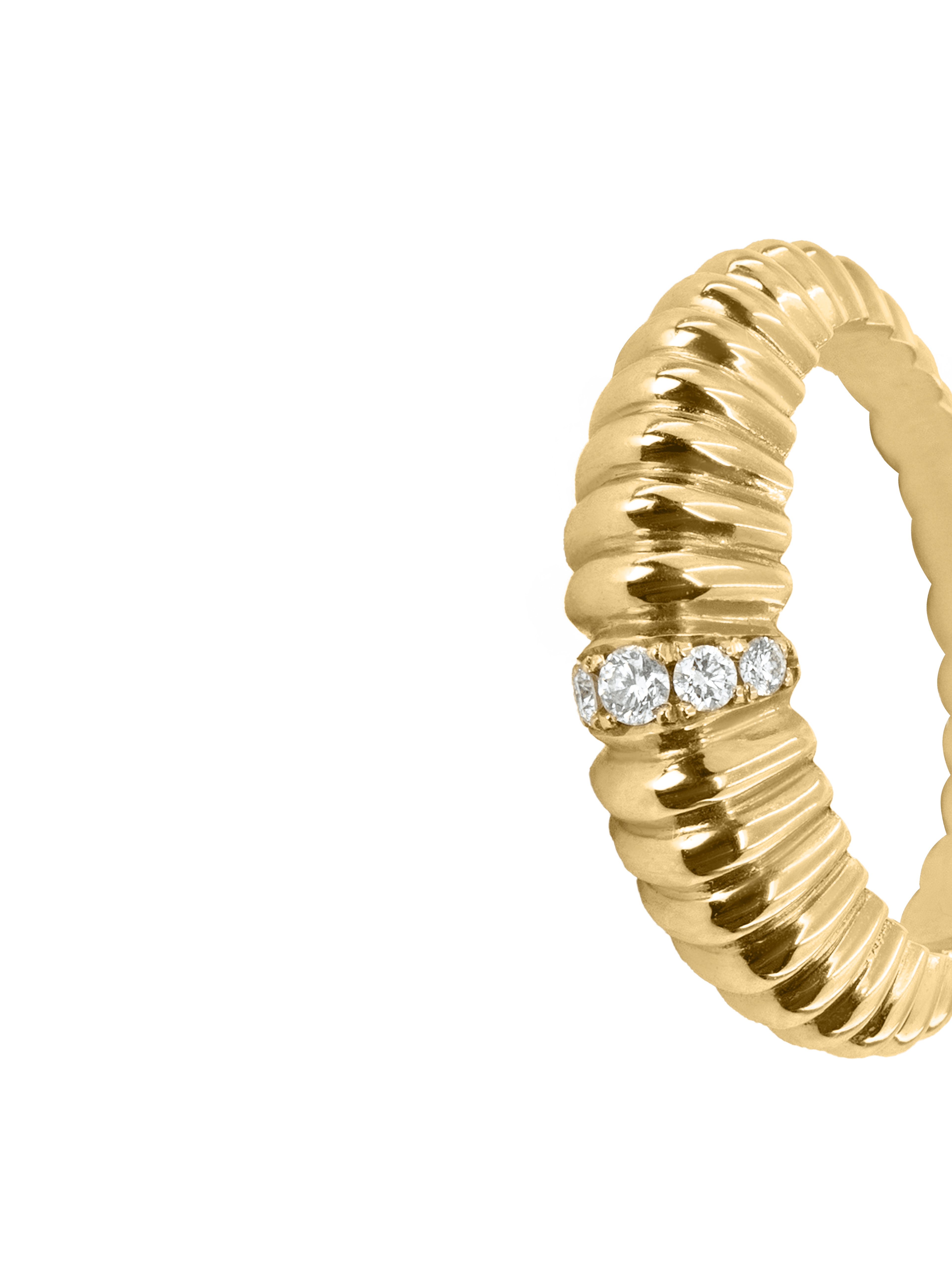 〝Lizzie Mandler's signature knife-edge fluting makes for a chic contemporary ring -- and the motif really comes into its own with the addition of a single stripe of diamond pave.〞