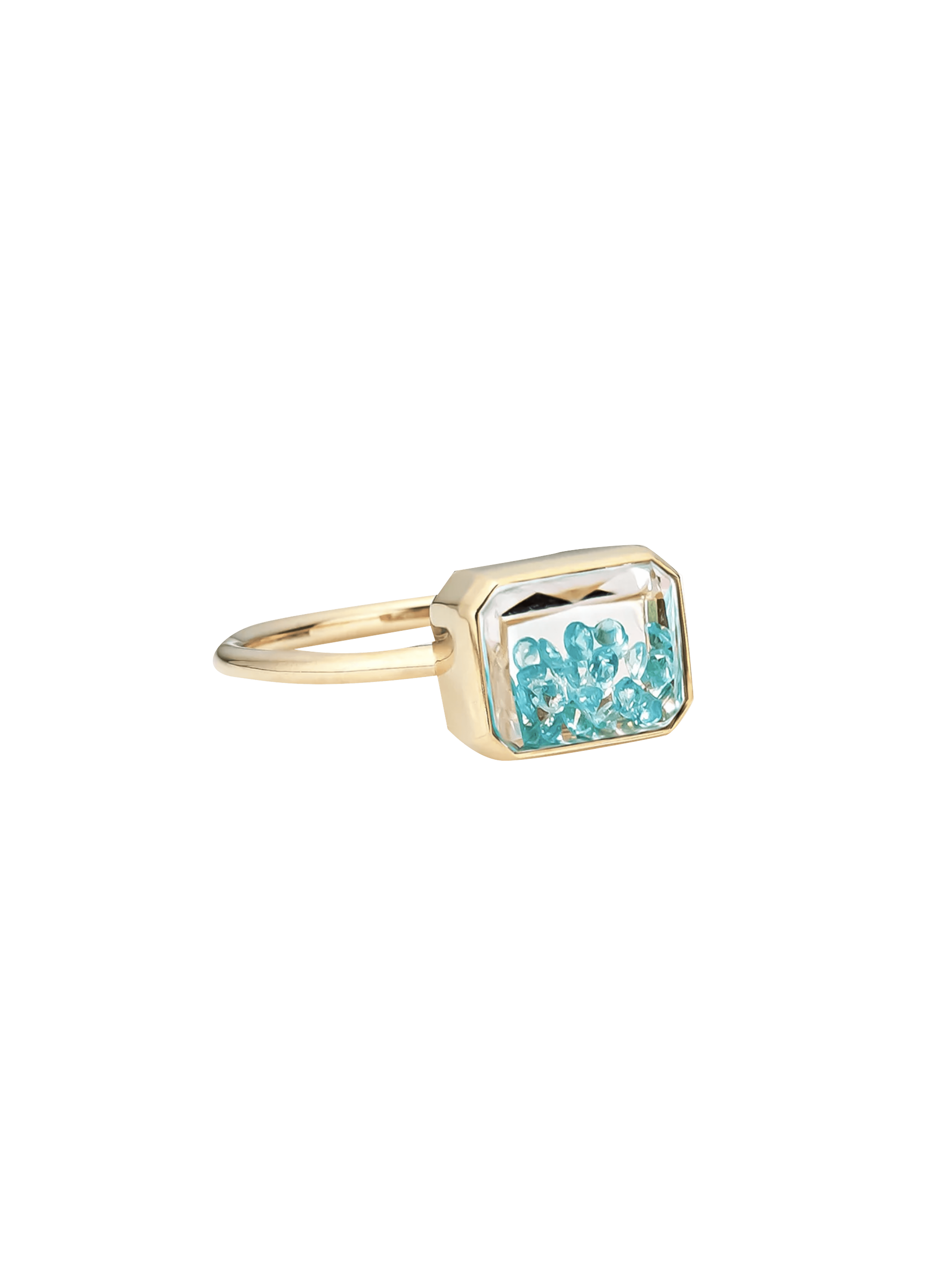 〝Loose Paraiba Brazilian tourmalines are caught in a sapphire window, in the Esmerelda Paraiba ring by Moritz Glik. As the gems within move with the wearer, the full magnificence of this unusual stone is revealed. 〞