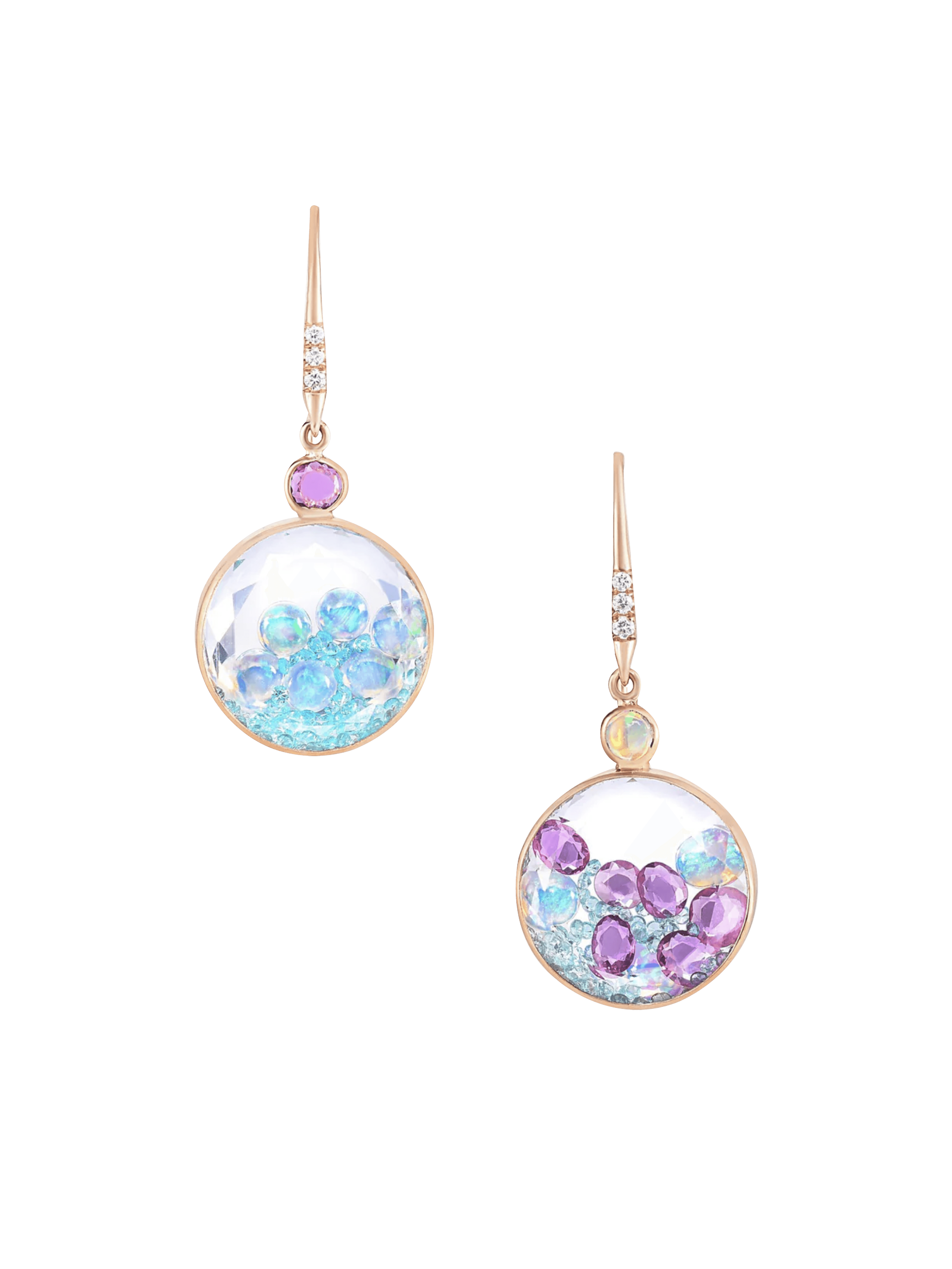 〝These spectacular statement earrings by Moritz Glik blend the ethereal radiance of Paraiba tourmalines with faceted pink sapphires, and firey opals, as the stones tumble and move within the Kaleidoscope Shakers™. 〞