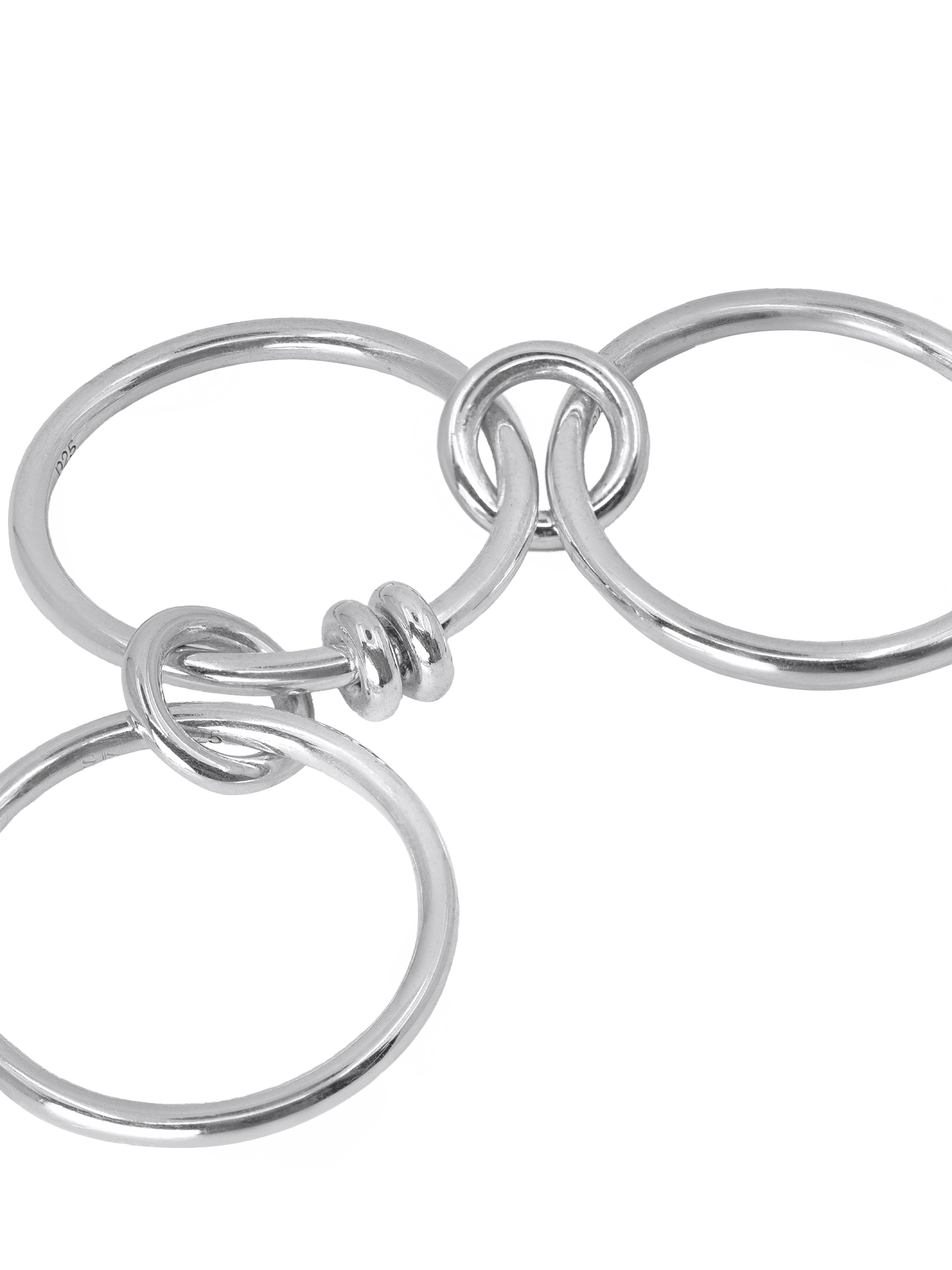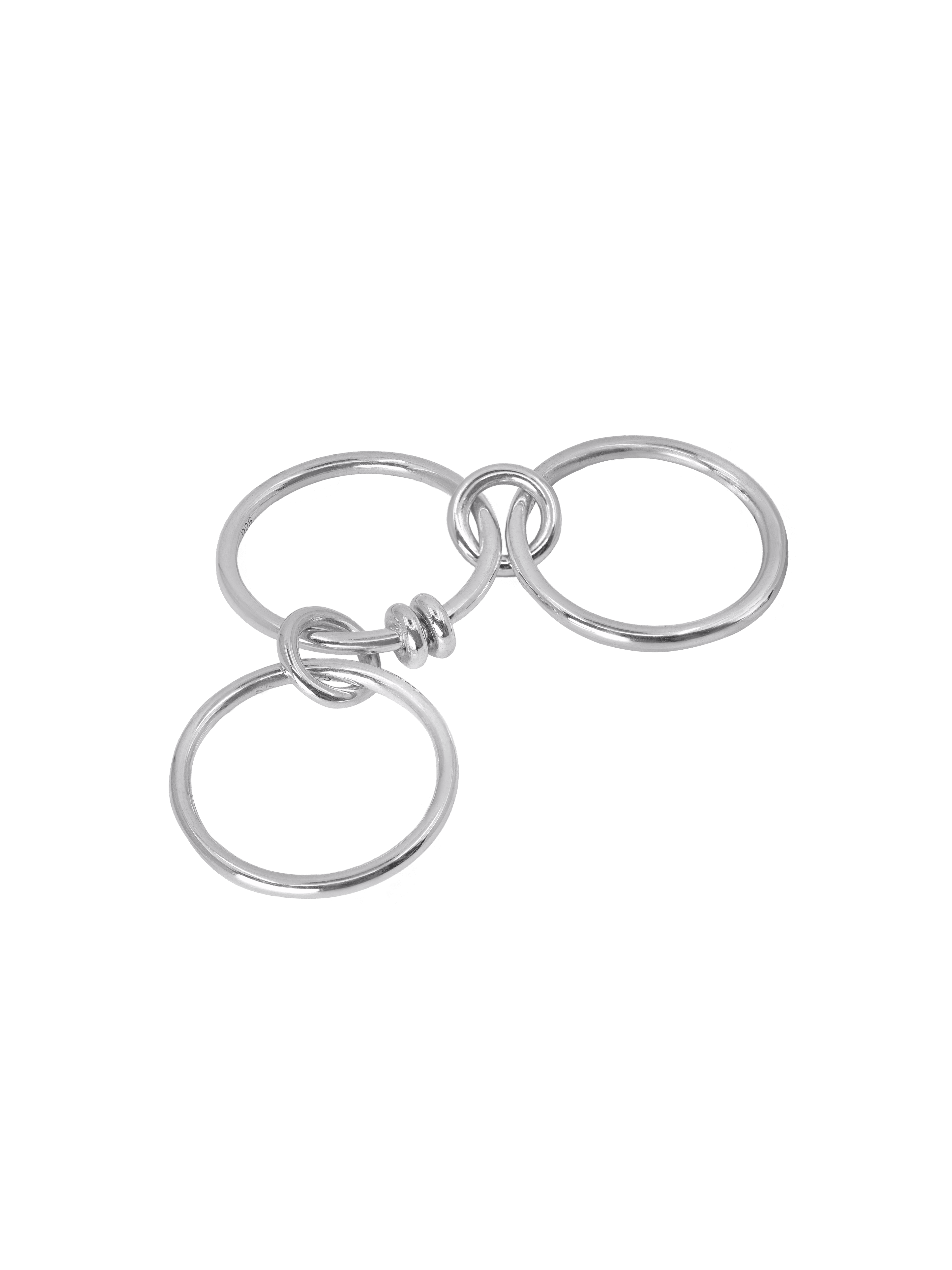 〝Minimalist and clean, Spinelli Kilcollin's Acacia ring sees three silver bands linked with a central ring detail, in a statement piece that's versatile enough to be worn delictely across the hand or boldy stacked on a single finger.〞