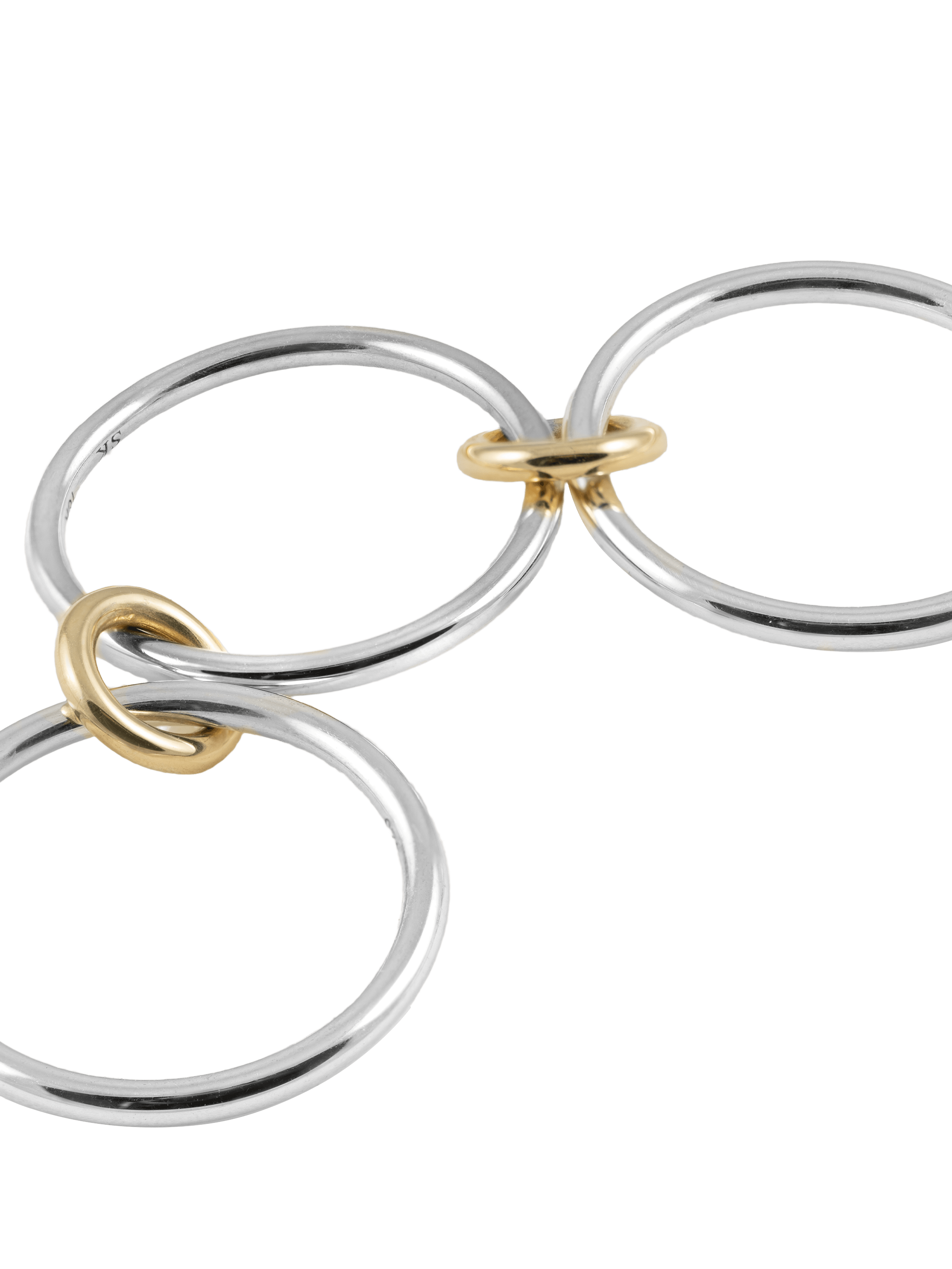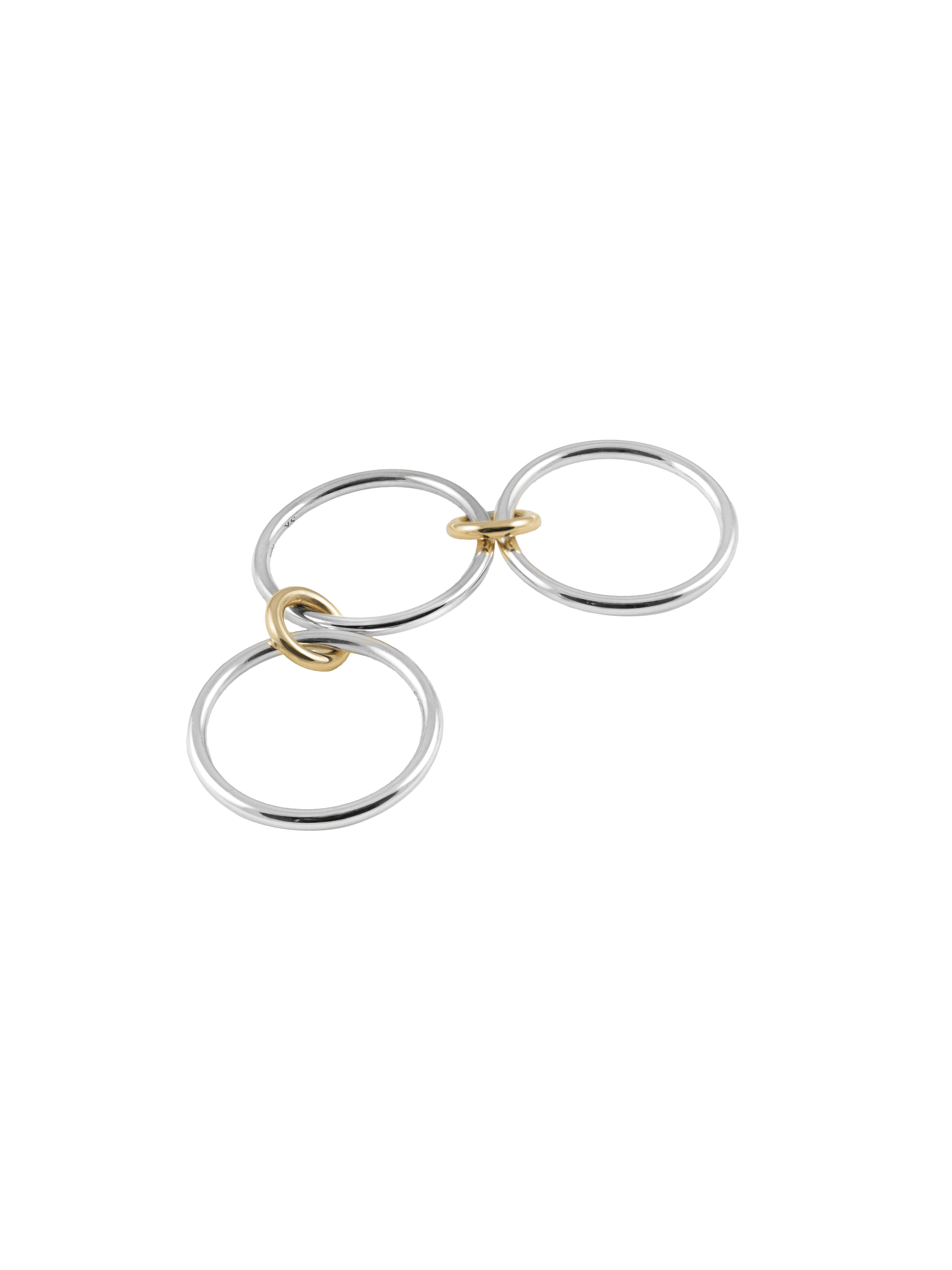 〝The Solarium ring in silver, by Spinelli Kilcollin highligts the easy-to-style appeal of bright, minimalist silver, accented with two gold connector rings. 〞